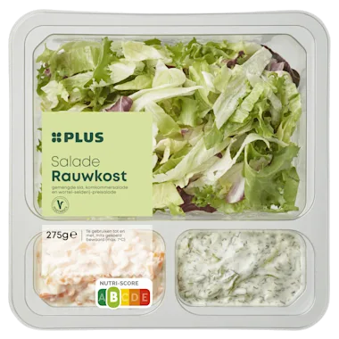 Ingrediënten :35% slamix (ijsbergsla, frisee, radicchio rosso), 35% komkommersalade (53% gezuurde komkommer (komkommer, azijn, suiker), dressing (water, plantaardige oliën (raapzaad, zonnebloem), suiker, gemodificeerd maïszetmeel, SCHARRELKIPPENEI-EIGEEL, azijn, zout, gehydrolyseerd SOJA-EIWIT, conserveermiddel: E202/E211, antioxidant: extracten van rozemarijn, verdikkingsmiddel: xanthaangom), voedingszuur: citroenzuur, aroma (MOSTERD)), yoghurt ( MELK), suiker, ui, slagroom (slagroom (MELK), stabilisator: E407), dille, dextrose, verdikkingsmiddel: guarpitmeel), 30% wortel-selderij-preisalade (dressing (water, plantaardige oliën (raapzaad, zonnebloem), suiker, gemodificeerd maïszetmeel, SCHARRELKIPPENEI-EIGEEL, azijn, zout, gehydrolyseerd SOJA-EIWIT, conserveermiddel: E202/E211, antioxidant: extracten van rozemarijn, verdikkingsmiddel: xanthaangom), voedingszuur: citroenzuur), aroma (MOSTERD)), 24% gezuurde wortelreepjes (wortel, azijn, zout, voedingszuur: citroenzuur), antioxidant: E300, 19% gezuurde knolselderijreepjes (SELDERIJ, azijn, zout, voedingszuur: citroenzuur, antioxidant: E300/E223), 12% prei, yoghurt (MELK), suiker, slagroom (slagroom (MELK), stabilisator: E407)).