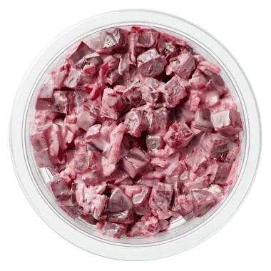 60% Gekookte rode biet, 20% yoghurtdressing (raapzaadolie, water, 12% yoghurt (MELK), suiker, brandewijnazijn, citroensap, SCHARRELKIPPENEI-EIGEEL, zout, verdikkingsmiddel: xanthaangom/johannesbroodpitmeel/guarpitmeel, gemodificeerd aardappelzetmeel, MOSTERDZAAD, gedroogde glucosestroop, conserveermiddel: E202/E211), 10% rode appel (99% appel, antioxidant: E300), 5% zoetzure augurk (95% augurk, water, suiker, azijn, zout, aroma), 5% witte ui.