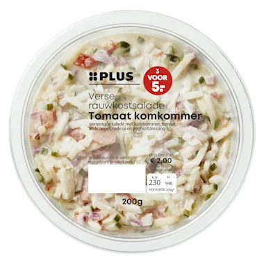 Ingrediënten :45% Komkommer, 18% tomaat, 15% yoghurtdressing (raapzaadolie, water, 12% yoghurt (MELK), suiker, brandewijnazijn, citroensap, SCHARRELKIPPENEI-EIGEEL, zout, verdikkingsmiddel: johannesbroodpitmeel/guarpitmeel/xanthaangom, gemodificeerd aardappelzetmeel, MOSTERDZAAD, glucosestroop, conserveermiddel: E202/E211), 13% rode appel (appel, antioxidant: E300), 10% rode ui.
