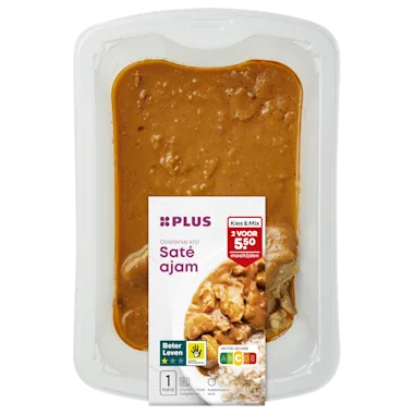 Ingrediënten :water, 28% gemarineerde kippendijfilet (84% kippendijfilet*, suiker, volledig geraffineerde sojaolie, ketjap (water, rietsuiker, SOJA-EIWIT, kleurstof: E150a, zout, verdikkingsmiddel: E466, conserveermiddel: E202), zout, sambal (gemalen chilipeper, zout, water, zuurteregelaar: E260/E330, conserveermiddel: E211), gistextract (gistextract, zout, zonnebloemolie), komijnzaad, koriander, citroensap, kurkuma), 16% gemalen PINDA'S, suiker, ui, volledig geraffineerde sojaolie, tomatenpuree, volkoren TARWEMEEL, ketjap (water, suiker, glucosestroop, gehydrolyseerd SOJA-EIWIT, kleurstof: E150d, zout, verdikkingsmiddel: E466, voedingszuur: E330, gemodificeerd aardappelzetmeel, conserveermiddel: E202, kruiden, specerijen), knoflook, gember, azijn (water, azijn, kleurstof: E150d), zout, gistextract (gistextract, zout, zonnebloemolie), sambal (gemalen chilipeper, zout, water, zuurteregelaar: E260/E330, conserveermiddel: E211).