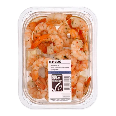 Ingrediënten :93% Witpootgarnaal (witpootgarnaal (Litopenaeus vannamei) (SCHAALDIEREN)*, zout, zuurteregelaar: E260/E270/E330, antioxidant: E223 (SULFIET)), 8% knoflookmarinade (raapzaadolie, 14% knoflook, voedingszuur: E330, zout, kruiden (dille, peterselie, bieslook), paprikagranulaat).