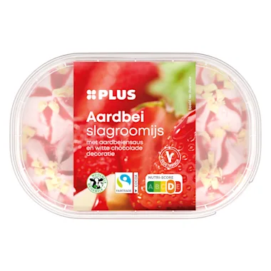 Aardbeienslagroomijs met 15% aardbeiensaus en 1,6% witte chocoladedecoratie.