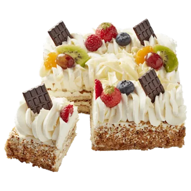Slagroomtaart gevuld met 16% witte topping op basis van melk en plantaardige olie, gedecoreerd met 34% slagroom, 7% nougatine, 6% fruit en 4,9% witte- en pure chocoladedecoratie