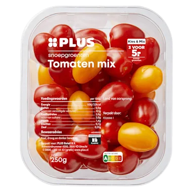 Biologisch PLUS Tomaten Zak 250 gram, PLUS Komkommer Schaal 230 gram, PLUS Radijsmix Schaal 250 gram, PLUS Paprika Schaal 175 gram, PLUS Paprika pitloos Schaal 175 gram, PLUS Tomaten mix of rood Schaal 250 gram 3 schalen