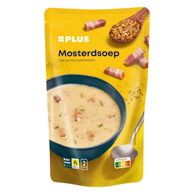 Ingrediënten :Water, 5% MOSTERD (water, MOSTERDZAAD, zout, alcoholazijn, kurkuma), room' (MELK), 3% gerookte spekblokjes (varkensvlees*, zout, glucosestroop, conserveermiddel: natriumnitriet, natuurlijke rook), gemodificeerd maïszetmeel, raapzaadolie, natuurlijke aroma's, TARWEBLOEM, bieslook, MELKEIWIT, 0,2% MOSTERDZAAD, kokosolie, specerij, zout, peterselie.