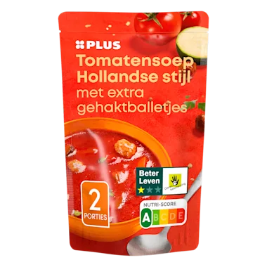 Ingrediënten :water, 20% tomatenblokjes, 10% geconcentreerde tomatenpuree, 6% soepballen (73% varkensvlees*, 19% rundvlees**, water, voedingszuur: E330, zout, varkenseiwit, zonnebloemolie, specerijen, laurier), 3% wortel, 3% ui, 3% courgette, 2% paprika, 2% BLEEKSELDERIJ, gemodificeerd maiszetmeel, suiker, zout, gistextract, kruiden (laurier, oregano, dragon, tijm), witte balsamicoazijn (wijnazijn, geconcentreerde druivenmost, natuurlijk aroma), raapzaadolie, cichoreivezel, witte peper, kleurstof: E160c.