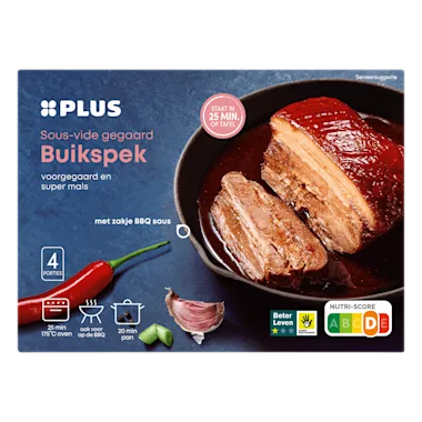 88% Gemarineerd buikspek (78% varkensvlees*, 14% marinade (water, melasse, gemberpuree, knoflookpuree, chilipeper, zout, gehydrolyseerde plantaardige eiwitten (SOJA, maïs), natuurazijn, conserveermiddel: E202, voedingszuur: azijnzuur), 6% water, natuurlijk aroma, zout, voedingszuur: E326, antioxidant: E301), 12% barbecuesaus (water, suiker, natuurazijn, tomatenpuree, gemodificeerd aardappelzetmeel, zout, rookaroma, specerijen (zwarte peper, piment, knoflookpoeder), gebrande suiker, conserveermiddel: E202). * = Beter Leven keurmerk 1 ster.