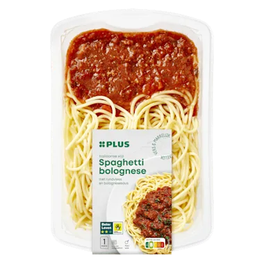 Ingrediënten :51% gekookte spaghetti (water, TARWEGRIESMEEL, raapzaadolie), 49% bolognesesaus (34% tomaat, water, 12% gegaard rundvlees*, 8% tomatenpuree, 7% gezeefde tomaat, wortel, ui, gemodificeerd maïszetmeel, suiker, raapzaadolie, kruiden, natuurlijke aroma's (bevat SELDERIJ), rode wijn, zout, kaliumchloride, specerijen, gistextract).