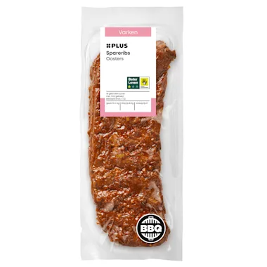 Ingrediënten: 91% gegaarde spareribs (95% varkensvlees*, water, suiker (wit, bruin), gemodificeerd aardappelzetmeel, zout, dextrose, SOJASAUSPOEDER (SOJABONEN, TARWE, zout, maltodextrine), specerijen (chilipeper, paprikapoeder, zwarte peper, korianderzaad, nootmuskaat, gemberpoeder, venkelzaad, kaneel), gistextract, groentepoeder (tomaten, ui, knoflook), gehydrolyseerd SOJA-EIWIT, melassepoeder (melasse, maltodextrine), gekaramelliseerde suiker, natuurlijk aroma, aardappelvezel, zoethoutpoeder, kruiden (rozemarijn, tijm, laurier), extract van paprika), 10% marinade (water, suiker, natuurazijn, 7% specerijen (kerriepoeder (gember, kardemom, korianderzaad, komijn, zwarte peper, foelie), kurkuma, knoflookpoeder, cayennepeper, citroengraspoeder, tamarindepoeder, paprikapoeder), gemodificeerd maïszetmeel, zout, peterselie, zonnebloemolie, gefruite ui (ui, palmolie, TARWEBLOEM, zout), natuurlijk aroma, kleurstof (E160c), conserveermiddel (E202, E211). *= Beter Leven keurmerk 1 ster.