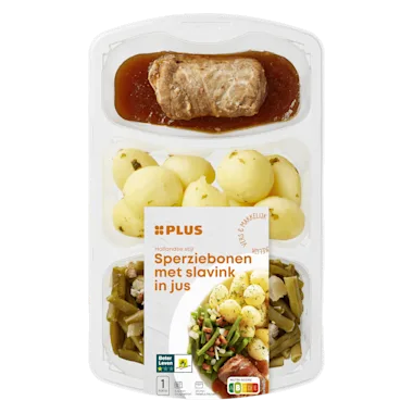 Ingrediënten :38% sperziebonen (99% gekookte sperziebonen, nootmuskaatextract, zout, aroma (bevat SELDERIJ, TARWE)), 30% krielaardappeltjes met peterselie (99% gekookte aardappel, 0,6% peterselie), 16% slavink (60% varkensvlees*, 34% rundvlees*, paneermeel (TARWEBLOEM, ROGGE, gist, zout), water, TARWEZETMEEL, zout, varkensvet, specerijen, oregano, gekarameliseerde suiker, extract van paprika, gedroogde glucosestroop, kaliumchloride, dextrose, gistextract, natuurlijke aroma's, conserveermiddel: E261, zuurteregelaar: E262, voedingszuur: citroenzuur), 12% jus (water, gemodificeerd maïszetmeel, natuurlijke aroma's (bevat SELDERIJ), raapzaadolie, suiker, tomatenpuree, zout, rode wijnextract, kaliumchloride, wijnazijn, gekaramelliseerde suiker, conserveermiddel: E202, verdikkingsmiddel: E406, specerijen, druivenmostconcentraat, geroosterd uienpoeder, gistextract, kleurstof: E150d), 4% spek en ui (49% spekblokjes (94% varkensvlees*, nitrietpekelzout (zout, conserveermiddel: E250), antioxidant: E301, specerijenextracten (rozemarijn, kardemom, witte peper), beukenhoutrook), 49% ui, raapzaadolie).