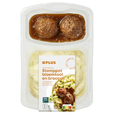 Ingrediënten :67% aardappel-bloemkool-broccolistamppot (52% gekookte aardappel, 20% gekookte bloemkool, 20% gekookte broccoli, room (MELK), raapzaadolie, water, geraspte kaas (gepasteuriseerde MELK**, zout, zuursel, stremsel, aardappelzetmeel), aardappelvlokken, zout, kaliumchloride, aroma (bevat SELDERIJ, TARWE), specerijen, gistextract, natuurlijk aroma), 17% uienjus (water, 18% gebakken ui (90% ui, plantaardige oliën (raapzaad, zonnebloem, in wisselende verhoudingen)), gemodificeerd maïszetmeel, natuurlijke aroma's (bevat SELDERIJ), raapzaadolie, suiker, tomatenpuree driemaal geconcentreerd, conserveermiddel: E202, zout, rode wijnextract, kaliumchloride, wijnazijn, gekaramelliseerde suiker, verdikkingsmiddel: E406, specerijen, druivenmostconcentraat, geroosterd uienpoeder, gistextract, kleurstof: E150d), 16% gehaktbal (73% varkensvlees*, TARWEZETMEEL, VRIJE-UITLOOPKIPPENEI, paneermeel (TARWEBLOEM, zout, gist, ROGGE), gedroogde groenten (geroosterde ui, paprika, ui), ui, MOSTERD (water, MOSTERDZAAD, kurkuma, natuurazijn, zout, natuurlijk kruidenaroma), raapzaadolie, water, peterselie, gekaramelliseerde suiker, zout, kaliumchloride, ketjapsaus (suiker, melasse, water, SOJASAUS (water, SOJABONEN, TARWE, zout), zout, natuurazijn, TARWEZETMEEL, natuurlijk aroma (bevat TARWE)), dextrose, specerijen, knoflookpuree, natuurlijke aroma's (bevat TARWE)).