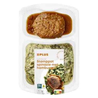 Ingrediënten :70% spinaziestamppot (63% gekookte aardappel, 34% spinazie, raapzaadolie, zout, kaliumchloride, natuurlijke aroma's (bevat SELDERIJ), zwarte peper, gistextract), 16% gegaarde hamburger (47% varkensvlees*, 31% rundvlees*, paneermeel (TARWEBLOEM, ROGGE, gist, zout), ui, zetmeel (aardappel, TARWE), VRIJE-UITLOOPKIPPENEI, natuurlijke aroma's, zout, dextrose, peterselie, witte peper, kaliumchloride, gekaramelliseerde suiker, conserveermiddel: E261, voedingszuur: E330), 14% MOSTERDJUS (water, 7% MOSTERD (water, MOSTERDZAAD, brandewijnazijn, azijn, zout, specerijen, natuurlijk aroma, suiker), gemodificeerd maïszetmeel, natuurlijke aroma's (bevat SELDERIJ), raapzaadolie, suiker, tomatenpuree, TARWEBLOEM, rode wijnextract, wijnazijn, gekaramelliseerde suiker, conserveermiddel: E202, zout, verdikkingsmiddel: E406, kaliumchloride, specerijen, druivenmostconcentraat, geroosterd uienpoeder, gistextract, kleurstof: E150d).