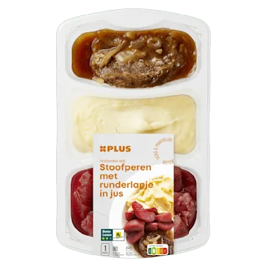 Ingrediënten :40% stoofperen (95% peer, water, suiker, wortelconcentraat, specerijen, voedingszuur: E330, conserveermiddel: E202, maltodextrine, karamelsuikersiroop), 28% aardappelpuree (78% gekookte aardappel, volle MELK, water, raapzaadolie, boter (MELK), zout, kaliumchloride, gistextract), 16% uienjus (water, 23% ui, plantaardige oliën (raapzaad, zonnebloem), gemodificeerd maïszetmeel, natuurlijke aroma's (bevat SELDERIJ), suiker, tomatenpuree, zout, rode wijnextract, kaliumchloride, wijnazijn, gekaramelliseerde suiker, conserveermiddel: E202, verdikkingsmiddel: E406, specerijen, druivenmostconcentraat, geroosterd uienpoeder, gistextract, kleurstof: E150d), 16% runderlapje (95% rundvlees*, rundereiwit, aardappelzetmeel, zout, gekaramelliseerde suiker, water, conserveermiddel: E261, voedingszuur: E330).