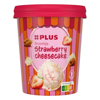 Roomijs met cheesecakesmaak, koekdeegstukjes en aardbeiensaus
