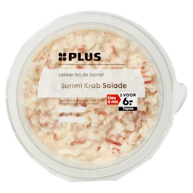 Ingrediënten :53% surimi (water, 34% WITVIS, aardappelzetmeel, gerehydrateerd SCHARRELEI-EIWIT, raapzaadolie, suiker, zout, stabilisator: E420/E452, aroma, kleurstof: E160c/E120)), raapzaadolie, water, tomaat, suiker, 3% gekookte krab (krab (SCHAALDIEREN), water, zout, voedingszuur: E330, conserveermiddel: E223), SCHARRELKIPPENEI-EIGEEL, azijn, gemodificeerd maïszetmeel, mosterd (water, MOSTERDZAAD, azijn, zout, suiker, kurkuma), sojasaus (water, zout, SOJABONEN, TARWE), natuurlijk aroma (MELK, SCHAALDIEREN), garnaalpoeder (SCHAALDIEREN), peterselie, paprikapoeder, rode biet, voedingszuur: E330/E270/E300, zuurteregelaar: E262/E325, conserveermiddel: E202/E211, stabilisator: E412.