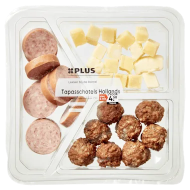 Trio tapas van 35% jong belegen 48+ kaasblokjes, 35% gekookte worst en 30% gehaktballetjes Hollandse stijl.