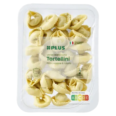 Ontdek de verfijnde balans van onze Tortellini met mascarpone en rucola: zijdezachte pasta gevuld met romige mascarpone en de frisse, licht pittige smaak van rucola.