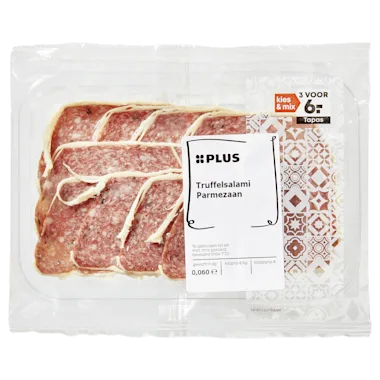 Ingrediënten :Varkensvlees, varkensgelatine, 7% parmezaanse kaas (MELK), gejodeerd zout, specerijen, 1,2% zomertruffel, aroma, specerijextracten (paprika, peper, fenegriek), dextrose, antioxidant: E301, conserveermiddel: E202/E250, fermentatiecultuur, rook, MELKEIWITTEN. Voor 100g eindproduct is 120g varkensvlees gebruikt.