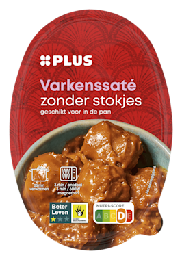Ingrediënten: water, 30% varkensvlees*, suiker, 9% PINDA'S, gehydrolyseerd SOJA-EIWIT, gemodificeerd maiszetmeel, tomatenpuree, melasse, zout, SOJABONEN, TARWE, azijn, natuurlijke aroma's, conserveermiddel (E202), gebrande suiker, knoflookpoeder, gemberpoeder, koriander, uienpoeder, gemalen laos, gistextract, zoethoutwortelextract, invertsuikerstroop, salmiakzout, SOJA-EIWIT, aardappelzetmeel, zuurteregelaar (E451), ui, gehydrolyseerd raapzaadeiwit, paprikapoeder, zwarte peper, knoflook, plantaardige oliën in wisselende verhoudingen (zonnebloem, raapzaad, palm). *= Beter Leven keurmerk 1 ster.
