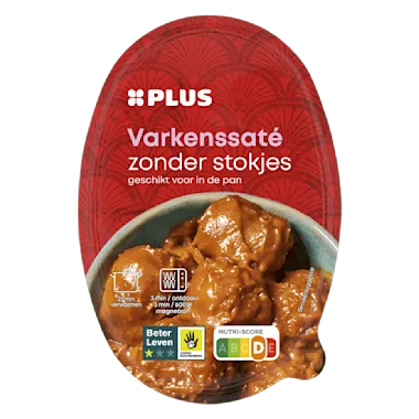Ingrediënten :65% PINDASAUS (water, 14% PINDA, suiker, gehydrolyseerd SOJA-EIWIT, gemodificeerd maiszetmeel, tomatenpuree, melasse, zout, SOJASAUS (water, SOJABONEN, TARWE, zout), azijn, natuurlijke aroma's, conserveermiddel: E202, gebrande suiker, gistextract, zoethoutextract, invertsuikerstroop, salmiak, specerijen), 35% gegaard satéblokje (86% varkensvlees*, water, SOJA-EIWIT, aardappelzetmeel, zuurteregelaar: E451, specerijen, zout, ui, gehydrolyseerd raapzaadeiwit, suiker, knoflook, plantaardige oliën (zonnebloem, palm, raap, in wisselende verhoudingen)).