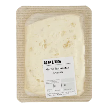 80% Roomkaasbereiding (MELK, 37% room (MELK), rundergelatine, magere MELKPOEDER, zuursel, zout), 20% ananasproduct (43% ananas, suiker, water, gemodificeerd maiszetmeel, voedingszuur: citroenzuur, conserveermiddel: E220(SULFIET)/E223(SULFIET), verdikkingsmiddel: pectinen/xanthaangom, aroma, conserveermiddel: E202, kurkuma-extract), conserveermiddel: E200.