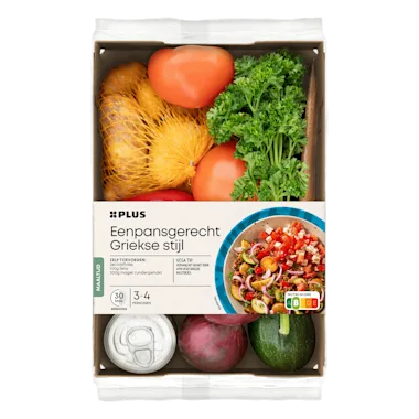 Groentepakket voor de bereiding van een eenpansgerecht, met een netje krieltjes (350g), een blikje tomatenpuree (70g) en een zakje mix met gyroskruiden (15g)