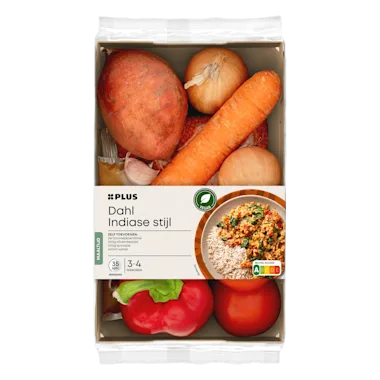 Groentepakket voor de bereiding van Indiase stijl dahl met een zakje rode linzen (200g), een zakje mix met specerijen (20g) en een groentebouillonblokje (10g)