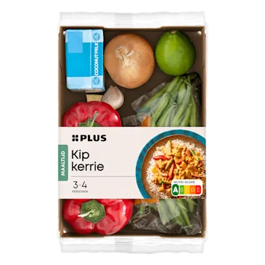 Groentepakket voor de bereiding van kip kerrie met een een pakje kokosmelk (200ml), een groentebouillonblokje (10g) en een zakje mix met specerijen (8g)