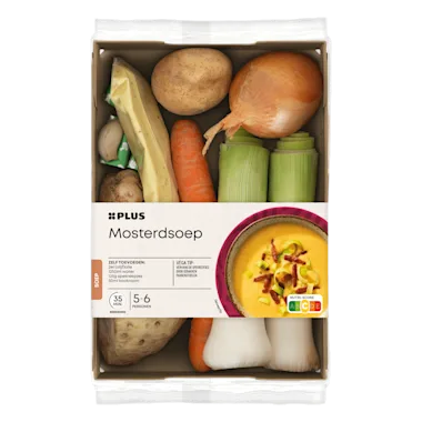 Groentepakket voor de bereiding van mosterdsoep met een zakje mosterdsaus (70 g) en drie groentebouillonblokjes (30 g)