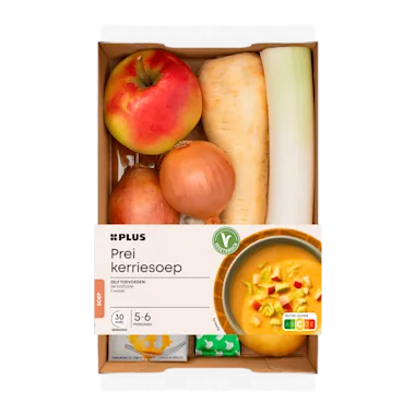 Groentepakket voor de bereiding van prei-kerriesoep met een pakje kookroom (200ml), groentebouillonblokjes (20g) en een zakje mix met specerijen (8g)