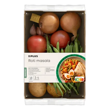 Pakket voor de bereiding van Roti Massala met een zakje boemboe (100g) en een groentebouillonblokje (10g)