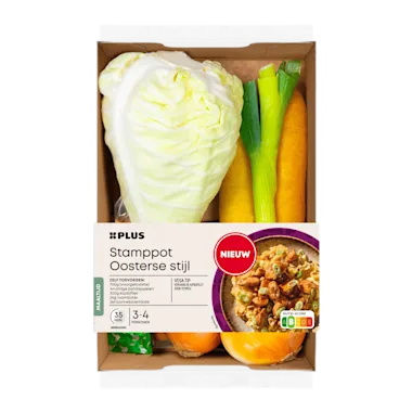 Groentepakket voor de bereiding van oosterse stijl stamppot met een zakje ketjap specerijenpasta (100g), een zakje pinda's (35g), een groentebouillonblokje (10g) en een zakje kerrie specerijenmix (8g).