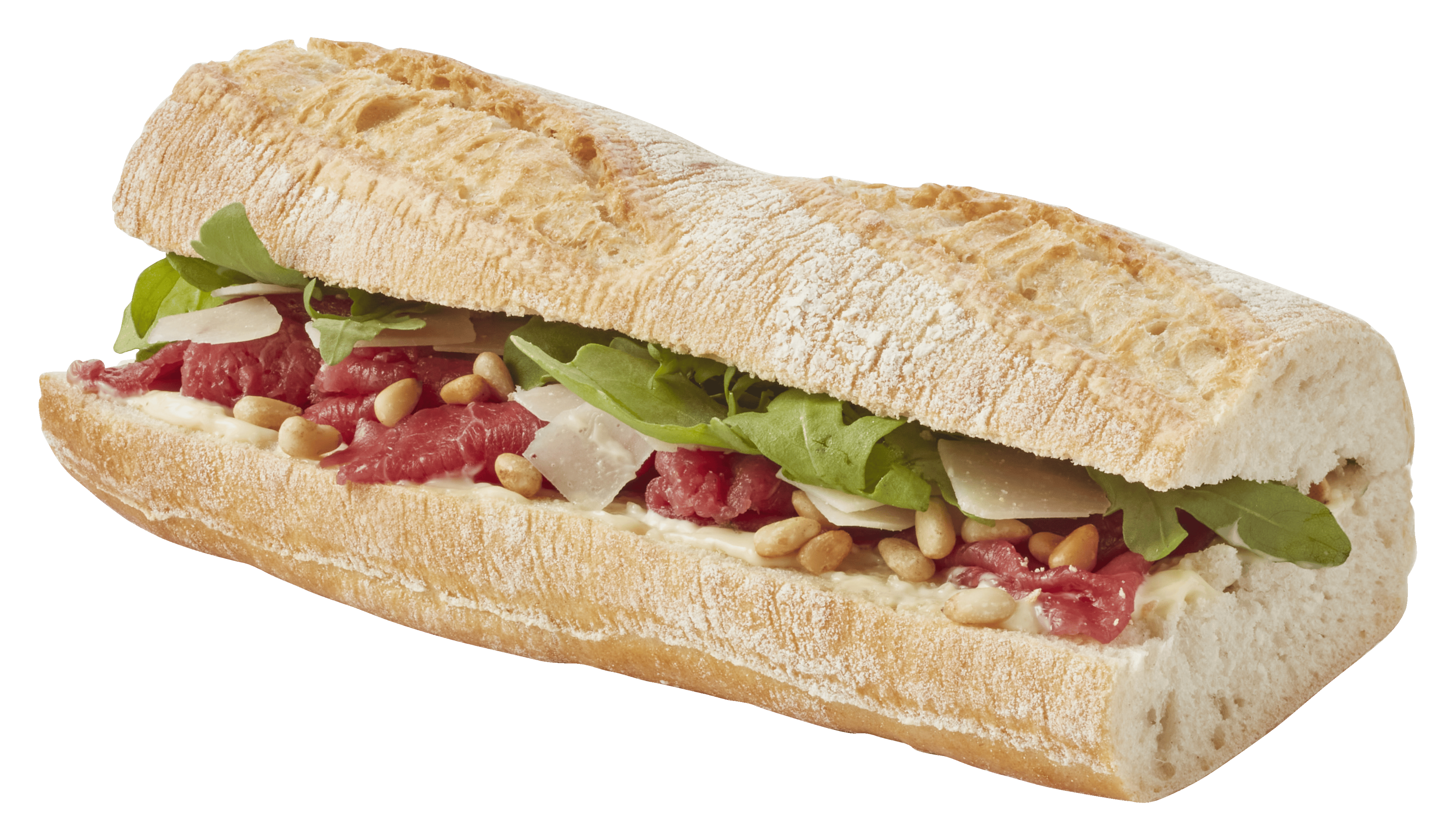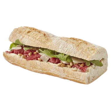 wit tarwebroodje met rundercarpaccio, rucola, Grana Padano flakes, mayonaise met truffel en geroosterde pijnboompitten