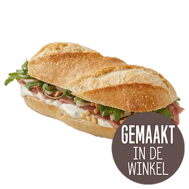 wit TARWEBROODJE (TARWEBLOEM, water, TARWEDESEM (water, TARWEBLOEM, zuurdesemcultuur), bakkerszout, bakkersgist, rijstmeel, TARWEGLUTEN, TARWEMOUTMEEL, meelverbeteraar: E300, koolzaadolie), rundercarpaccio, rucola, Grana Padano flakes (rauwe MELK, zout, conserveermiddel: E1105 (EI), stremsel), mayonaise met truffel (plantaardige oliën (raap, olijf), natuurazijn, water, SCHARRELKIPPENEI-EIGEEL, aroma’s (SELDERIJ, SOJA), vloeibare suiker, suiker, zout, MOSTERDZAAD, witte peper, truffel, champignongranulaat, conserveermiddel: E202, natuurlijk rozemarijn aroma), pijnboompitten.
