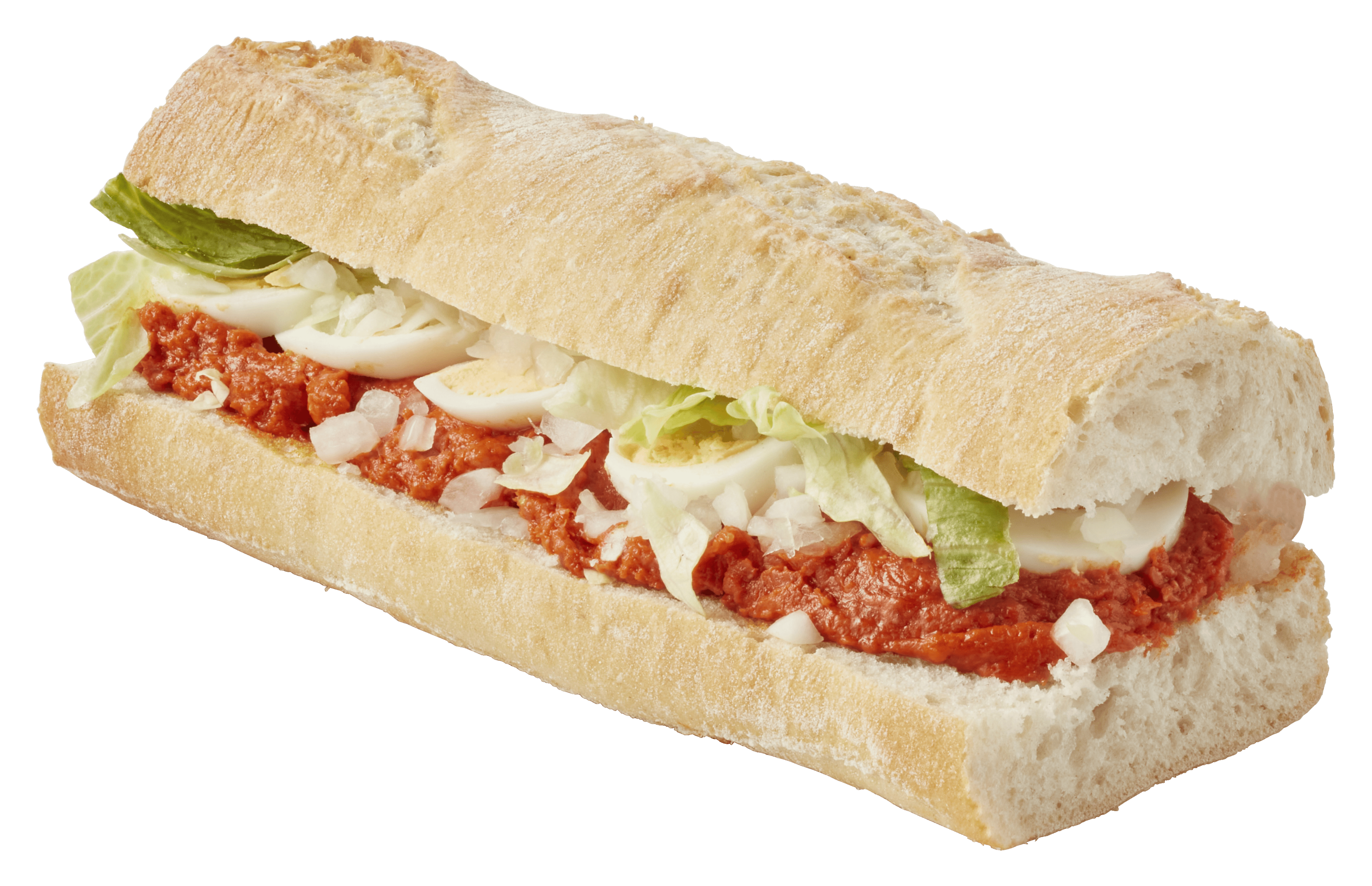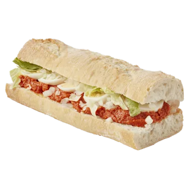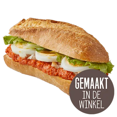 wit TARWEBROODJE (TARWEBLOEM, water, TARWEDESEM (water, TARWEBLOEM, zuurdesemcultuur), bakkerszout, bakkersgist, rijstmeel, TARWEGLUTEN, TARWEMOUTMEEL, meelverbeteraar: E300, koolzaadolie), filet americain (rundvlees, water, raapzaadolie, voedingszuur: E260/E262/E326/E330, zout, tomatenpuree, SCHARRELKIPPENEI-EIGEEL, specerijen (MOSTERD), glucose-fructosestroop, aroma's (MOSTERD), suiker, MELKEIWITTEN, rijstzetmeel, dextrose, natuurazijn, stabilisator: E331, gehydrolyseerde plantaardige eiwitten (SOJA, maïs), gistextract, MOSTERD (water, MOSTERDZAAD, specerijen, azijn, zout, suiker), verdikkingsmiddel: guarpitmeel, gemodificeerd maïszetmeel, antioxidant: E300, conserveermiddel: E202, lavas, specerijenextract (SELDERIJ, paprika, chilipeper, knoflook), tomatenpoeder), SCHARRELEI, ijsbergsla, ui.