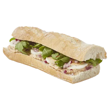 wit tarwebroodje met tonijnsalade, scharrelei, rucola en rode ui
