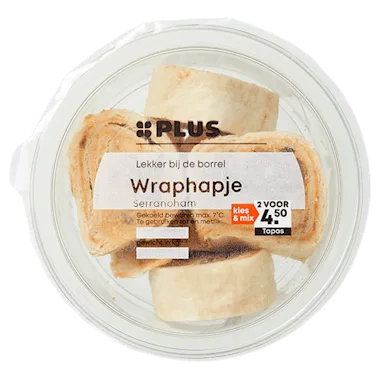 Ingrediënten :40% tomaat-roomkaasbereiding (68% roomkaasbereiding (81% roomkaas (gepasteuriseerde MELK, zout, zuursel, microbieel stremsel), zure room (MELK), gemodificeerd aardappelzetmeel, plantaardige oliën (zonnebloem, raapzaad), voedingszuur: E330, zout, conserveermiddel: E202), 17% tomatenpulp (zongedroogde tomaat, zout, voedingszuur: E330, conserveermiddel: E202), room (MELK), oregano, rundergelatine, witte peper), 36% wrap (TARWEBLOEM, water, raapzaadolie, rijsmiddel: E500/E450, dextrose, voedingszuur: E296, zout, meelverbeteraar: E920), 24% serranoham (varkensvlees, zout, antioxidant: E301, conserveermiddel: E252/E250).