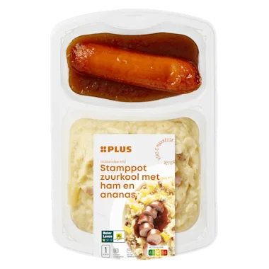 Ingrediënten :70% zomerzuurkoolstamppot (54% gekookte aardappel, 26% gekookte zuurkool (witte kool, zout), water, 6% rozijnen, 3% ananas, 1,7% gegaarde ham (60% varkensvlees*, water, aardappelzetmeel, nitrietpekelzout (zout, conserveermiddel: E250), witte peper, dextrose, antioxidant: E301, stabilisator: E450), raapzaadolie, suiker, zout, kaliumchloride, natuurlijk aroma, witte peper, gistextract, voedingszuur: E330/E300), 16% rookworst (74% varkensvlees*, water, 4% rundvlees*, zuurteregelaar: E326, zout, natuurlijk aroma, rundercollageen, erwtenvezel, dextrose, conserveermiddel: E261/E250, stabilisator: E450, voedingszuur: citroenzuur, inuline, psylliumvezel, maltodextrine, aardappelvezel, antioxidant: E301, rook), 14% jus (water, gemodificeerd maïszetmeel, natuurlijke aroma's (bevat SELDERIJ), raapzaadolie, suiker, tomatenpuree, zout, rode wijnextract, kaliumchloride, wijnazijn, gekaramelliseerde suiker, conserveermiddel: E202, verdikkingsmiddel: E406, specerijen, druivenmostconcentraat, geroosterd uienpoeder, gistextract, kleurstof: E150d).