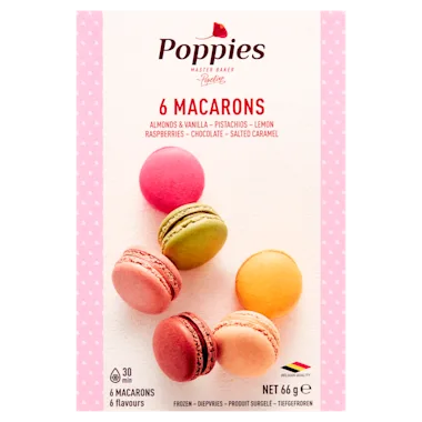 Amandelkoekjes met vanille-, citroen-,gezouten karamel-, chocolade-, framboos- of pistachevulling.