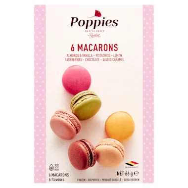 Amandelkoekjes met vanille-, citroen-,gezouten karamel-, chocolade-, framboos- of pistachevulling.