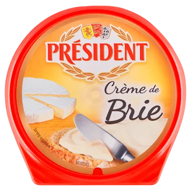 Ingrediënten: Brie Président (55%) (MELK), gereconstitueerde magere MELK, boter (MELK), MELKeiwitten, smeltzouten (E339, E452), conserveringsmiddel: kaliumsorbeat, verdikkingsmiddelen: xantaangom, johannesbroodbloem. Kan sporen van EI bevatten.