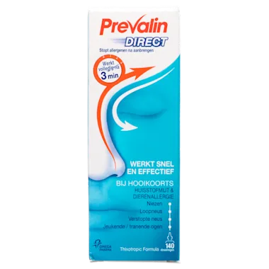 Geschikt voor atleten en tijdens de periode van zwangerschap en borstvoeding. Klinisch bewezen effectief. Bevat geen antihistamine of cortisone. Maakt niet slaperig. Prevalin Direct werkt snel en effectief tegen de eerste symptomen van allergische rhinitis (acute ontsteking van het neusslijmvlies). Geschikt voor volwassenen en kinderen vanaf 12 jaar.