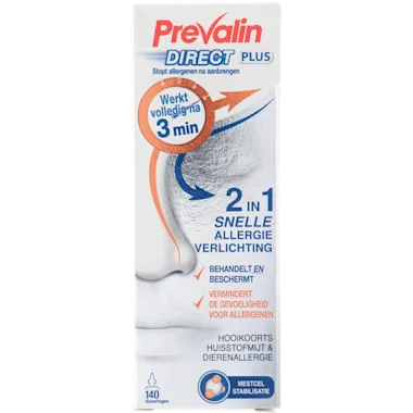 Geschikt voor atleten en tijdens de periode van zwangerschap en borstvoeding. Bevat geen geneesmiddelen (zoals antihistamine of cortisone). Maakt niet slaperig. Prevalin Direct Plus ontwikkeld met klinisch bewezen Nasya Technologie, biedt snelle en effectieve verlichting van allergie sympomen als: niezen, loopneus, verstopte neus jeukende/tranende ogen. Geschikt voor volwassenen en kinderen vanaf 12 jaar.