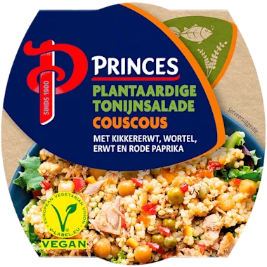 Ingrediënten: Water, Couscous (18,7%) (griesmeel van TARWE), Plantaardige tonijnstukjes (15,6%) (Gerehydrateerd plantaardig eiwit (78%) (Water, Eiwit van TARWE, Aardappel en Erwt), Zonnebloemolie, TARWE-gluten, Aardappelzetmeel, Natuurlijk aroma, Knoflook, Ui, Zout, Kaliumchloride, Gistextract, Anti-oxidant: Ascorbinezuur), Koolzaadolie, Kikkererwt (9,4%), Wortel (6,2%), Erwt (6,2%), Rode paprika (4,1%), Tomaat (3,1%), Ui (2,7%), Natuurijk aroma (bevat Ui), Zout, Geconcentreerd citroensap, Suiker, Verdikkingsmiddel: Guarpitmeel, Kruiden, Specerijen, Cayennepepe extract.