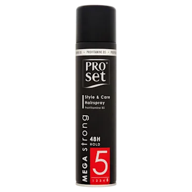 ProSet Hairspray Mega Strong geeft je haar een long lasting hold, en heeft fixatiekracht 5.