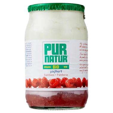 Biologische volle roeryoghurt op een bedje van frambozen in een glazen potje van 150g.