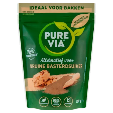 100g Pure Via® (17 kcal) = 100g Bruine Basterdsuiker (380 kcal)