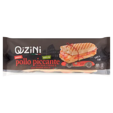 QiZiNi Panini Pollo Piccante is er eentje met pit! De panini is belegd met plakjes kipfilet, heerlijke Gouda kaas en een pittige saus, die zorgt voor een verrassende smaak. De Panini Pollo Piccante is ready to heat, dus alleen even in de oven en je kunt gaan genieten van deze lekker pittige panini.