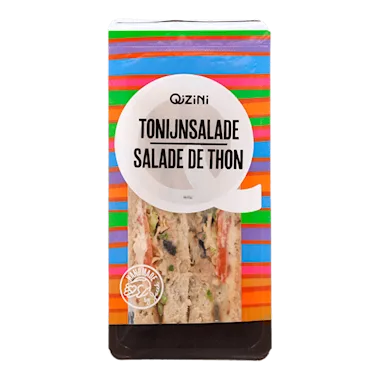 Ingrediënten: 41% wit tarwebrood (TARWEBLOEM, water, lijnzaad, zonnebloempitten, gist, raapzaadolie, bakkerszout, SESAMZAAD, SOJAMEEL), 18% sla dressing met zwarte peper (raapzaadolie, water, brandewijnazijn, EIGEEL*, gemodificeerd aardappelzetmeel, suiker, zout, mosterd [water, MOSTERDZAAD, brandewijnazijn, zout, suiker, specerijen], 0,8% zwarte peper, verdikkingsmiddel: xanthaangom, MOSTERDZAAD, witte peper), 18% gegaarde tonijn (TONIJN** [Katsuwonus pelamis], water, zout), 9% tomaat, 8% groene kool, 3% kappertjes (kappertjes, natuurazijn, water, zout), 2% zwarte olijven (olijven, zout, stabilisator: ijzer(II)gluconaat), 2% lente ui, zwarte peper. *scharreleieren. **Vangst conform de internationale MSC-standaard voor duurzame visserij. www.msc.org/nl
