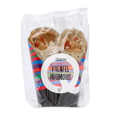 Ingredienten: 46% spinazie wrap (TARWEBLOEM, water, raapzaadolie, rijsmiddel: difosfaten/natriumcarbonaten, 1,7% spinazie, dextrose, voedingszuur: appelzuur, zout, meelverbeteraar: l- cysteïne), 14% kikkererwtenpuree (houmous) (58% kikkererwten, raapzaadolie, water, SESAMPASTA, zout, knoflook, voedingszuur: citroenzuur, conserveermiddel: sorbinezuur/benzoëzuur, specerijen), 13% spitskool, 13% gegaarde balletjes op basis van kikkererwten (falafel) (49% kikkererwten, water, groenten [ui, courgette, wortel], zonnebloemolie, TARWEBLOEM, kruiden [peterselie, koriander], kruiden, specerijen, azijn, zout, verdikkingsmiddel: methylcellulose, TARWE-EIWIT), 9% geblancheerde rode paprika, 3% water, sambal (45% rode peper, water, zout, natuurazijn, rijstzetmeel), natuurazijn, gemodificeerd aardappelzetmeel, chilipeper